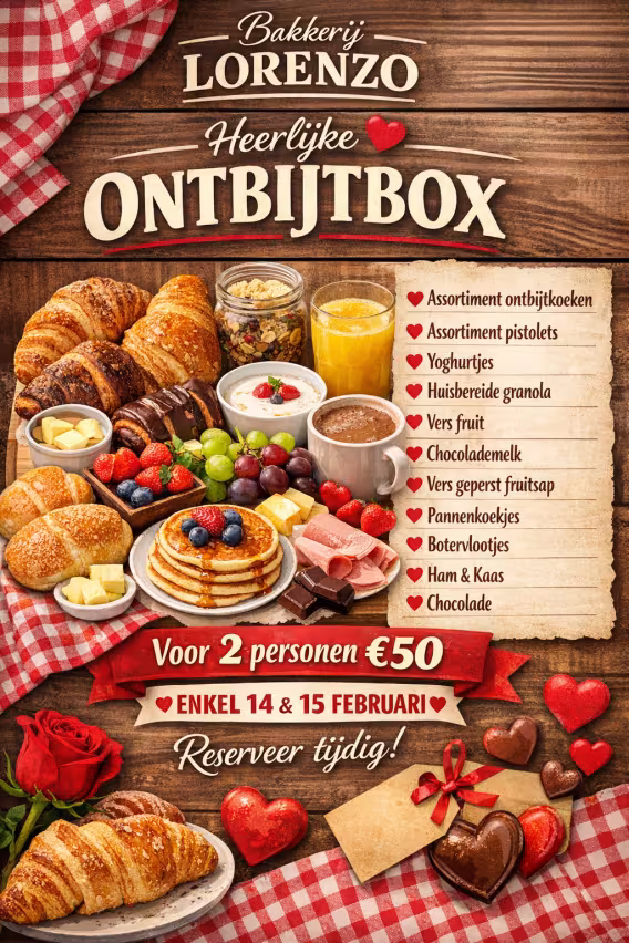 Op zaterdag 14/02 en zondag 15/02 kan u een luxe Valentijn ontbijt voor 2 personen bestellen.